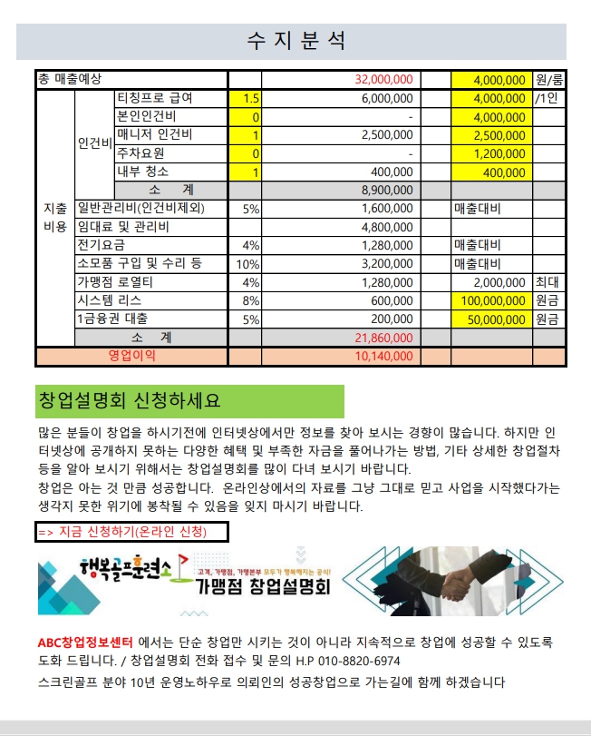 아는 만큼 보이는 스크린골프연습장 수지분석 자료입니다.